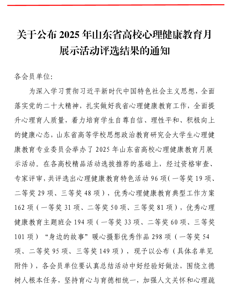 近日,2025年山东省高校心理健康教育月评选展示活动评选结果正式揭晓。在此次省级评选中,我院师生凭借扎实的专业素养与突出的创新能力崭露头角,最终斩获一等奖2项、二等奖2项、三等奖3项,充分彰显了我院在心理健康教育工作中的丰硕成果与实力。