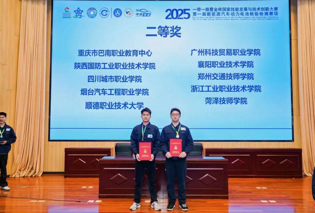 近日,2025一带一路暨金砖国家技能发展与技术创新大赛之新能源汽车动力电池检验检测赛项全国总决赛在石家庄职业技术学院圆满落幕。烟台汽车工程职业学院车辆运用工程系参赛选手郭其昊、肖雁华凭借扎实的专业技能、稳定的现场发挥和出色的团队协作,在众多参赛队伍中脱颖而出,斩获全国二等奖的优异成绩,展现了学院在新能源汽车领域高技能人才培养的显著成效。