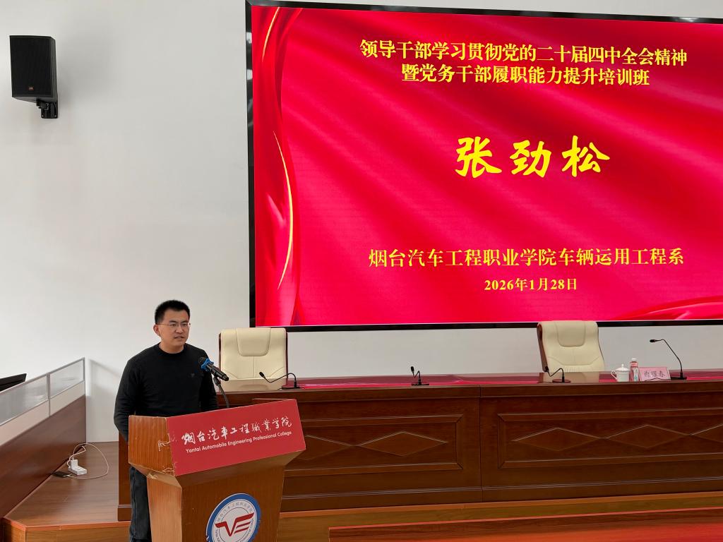为深入学习贯彻党的二十届四中全会精神,全面提升领导干部政治素养与党务干部履职能力,1月26日至28日,学院在第五会议室举办领导干部学习贯彻党的二十届四中全会精神暨党务干部履职能力提升培训班。学院党委书记秦桂建出席开班式并作专题辅导报告,党委副书记曲耀春出席结业式并作总结讲话,学院各党总支、直属党支部、党支部班子成员和副处级及以上领导干部参加培训。