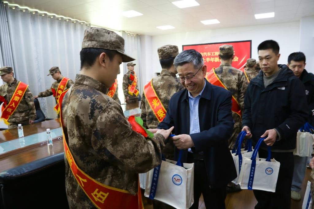 座谈会上,秦桂建代表学院向光荣应征的28名新兵表示热烈祝贺,向积极投身国防事业的汽院青年致以崇高敬意。他指出,大学生参军入伍是响应国家号召、履行国防义务的光荣选择,更是锤炼意志、增长才干、实现人生价值的重要舞台。他寄语新兵:一要坚定忠诚信仰,把爱国之心化为报国之行,听党指挥、忠诚使命;二要严守纪律规矩,快速适应军营生活,练就过硬军事本领;三要牢记母校嘱托,发扬汽院学子踏实肯干、勇于拼搏的优良作风,在海军、陆军、网空、武警等不同岗位上争先创优,为家乡争光、为学院添彩,努力成长为有灵魂、有本事、有血性、有品德的新时代革命军人。