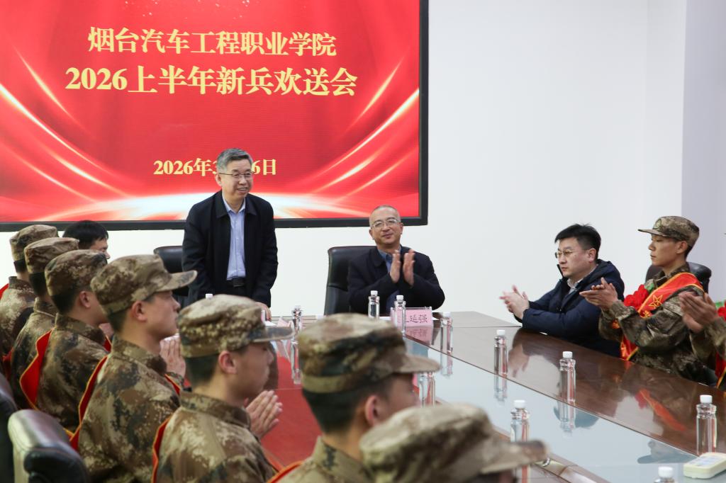 春风送暖,热血出征。为欢送即将踏入军营的学子,近日,烟台汽车工程职业学院召开2026年上半年新兵欢送会。学院党委书记秦桂建、副院长王延强出席座谈会,秦桂建书记发表讲话,并为新兵送上文创笔记本、签字笔与励志书籍,勉励大家淬炼成钢、建功军营,以青春之我守护家国安宁。