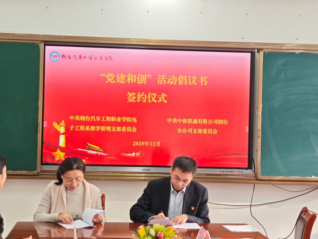 12月24日下午,在烟台汽车工程职业学院电子工程系会议室举行校企合作协议与“党建和创”活动倡议书双签约仪式。烟台汽车工程职业学院与中移铁通有限公司烟台分公司以党建为魂、以产业为基,构建起资源共享、优势互补、合作共赢的深度合作生态,解锁“党建+校企”共育新范式。