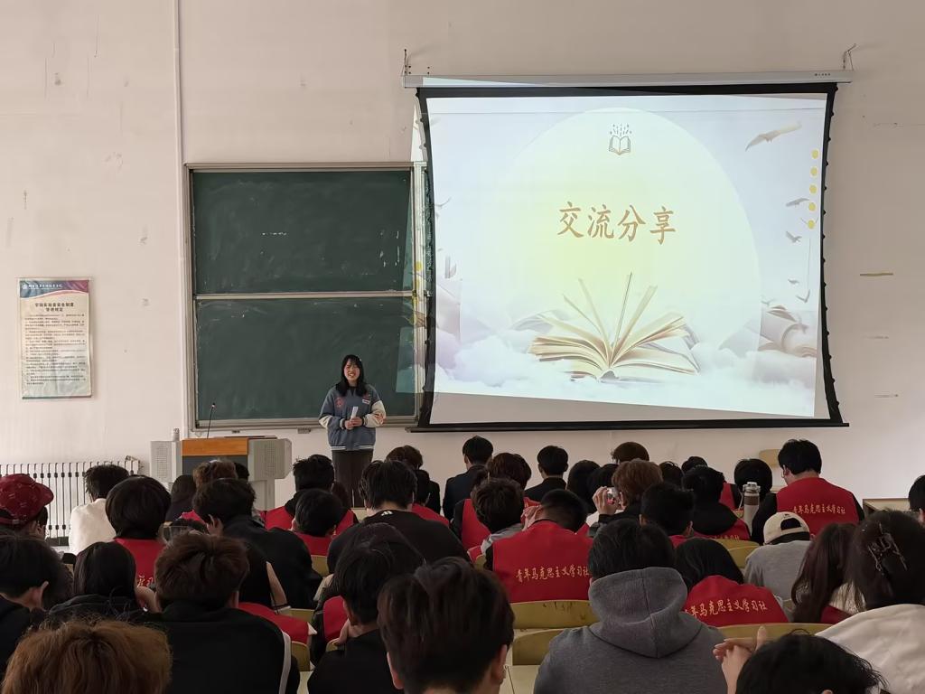 活动伊始,社团指导教师于恬为同学们分享了《习近平的七年知青岁月》一书。她选取了书中习近平总书记在梁家河插队期间带领村民打井、修淤地坝、办沼气等感人片段,生动讲述了习近平总书记当年在艰苦环境下坚持为老百姓做实事,同群众打成一片的成长历程。于恬老师在分享感悟时提到:“总书记知青时期的艰苦生活和成长历程,深刻诠释了‘青春是用来奋斗的’这一朴素真理,希望同学们从中汲取奋进力量,把个人理想融入国家和民族的事业之中。”